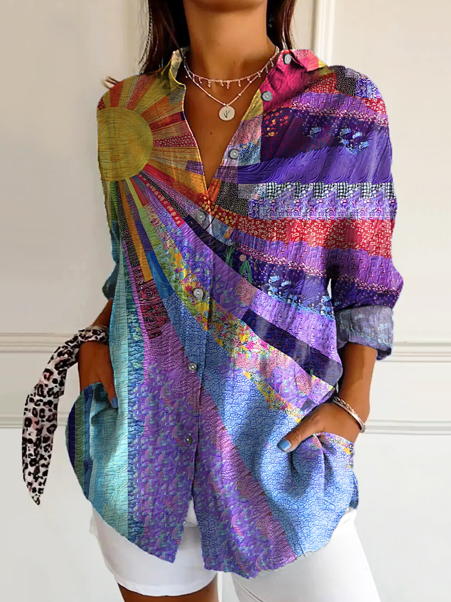 Women's Colorful Sun Collage Art Print Casual Cotton Shirt