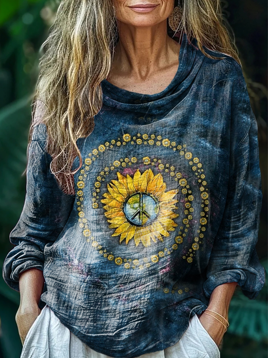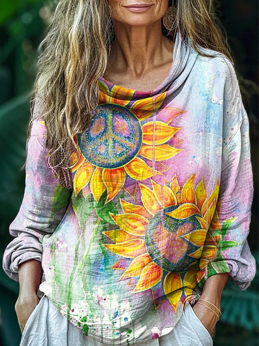 Women's Hippie Sunfloral Art Print Casual Long Sleeve Comfortable Cotton Shirt
