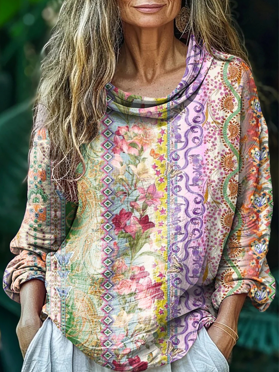 Women's Vintage Ethnic Floral Art Print Casual Long Sleeve Comfortable Cotton Shirt