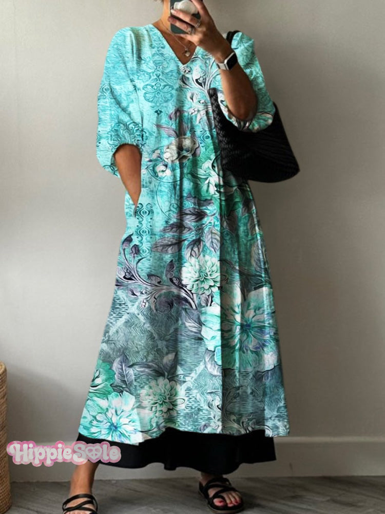 Women's Boho Floral Art Print Casual V-Neck Pocket Cotton Dress
