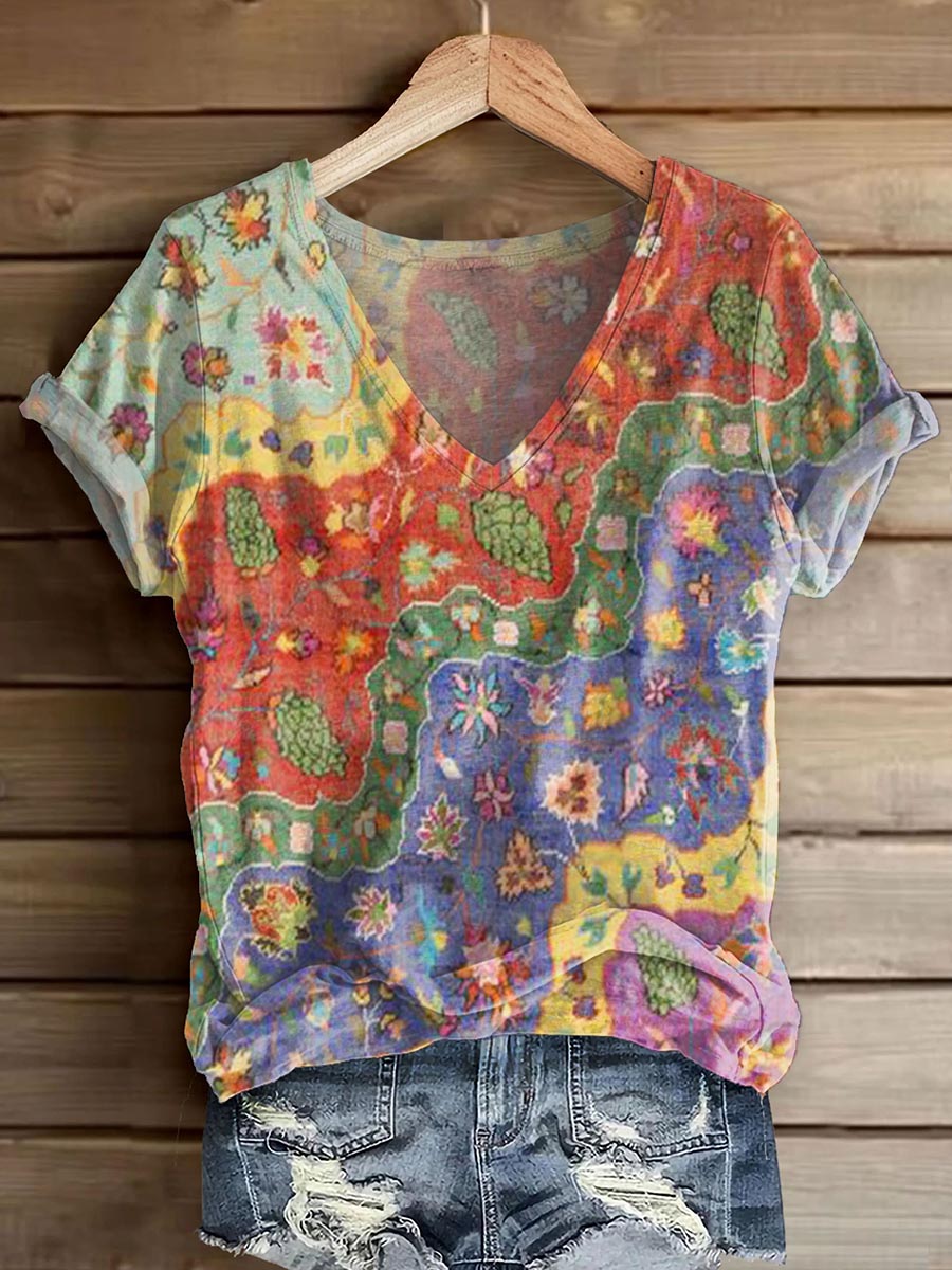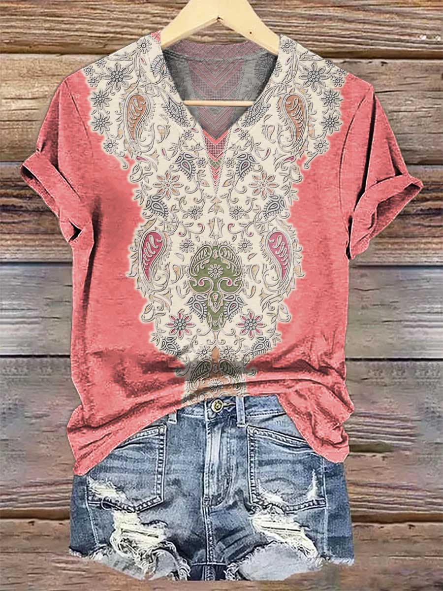 Women's Vintage Ethnic Floral Art Print V-neck Casual T-Shirt