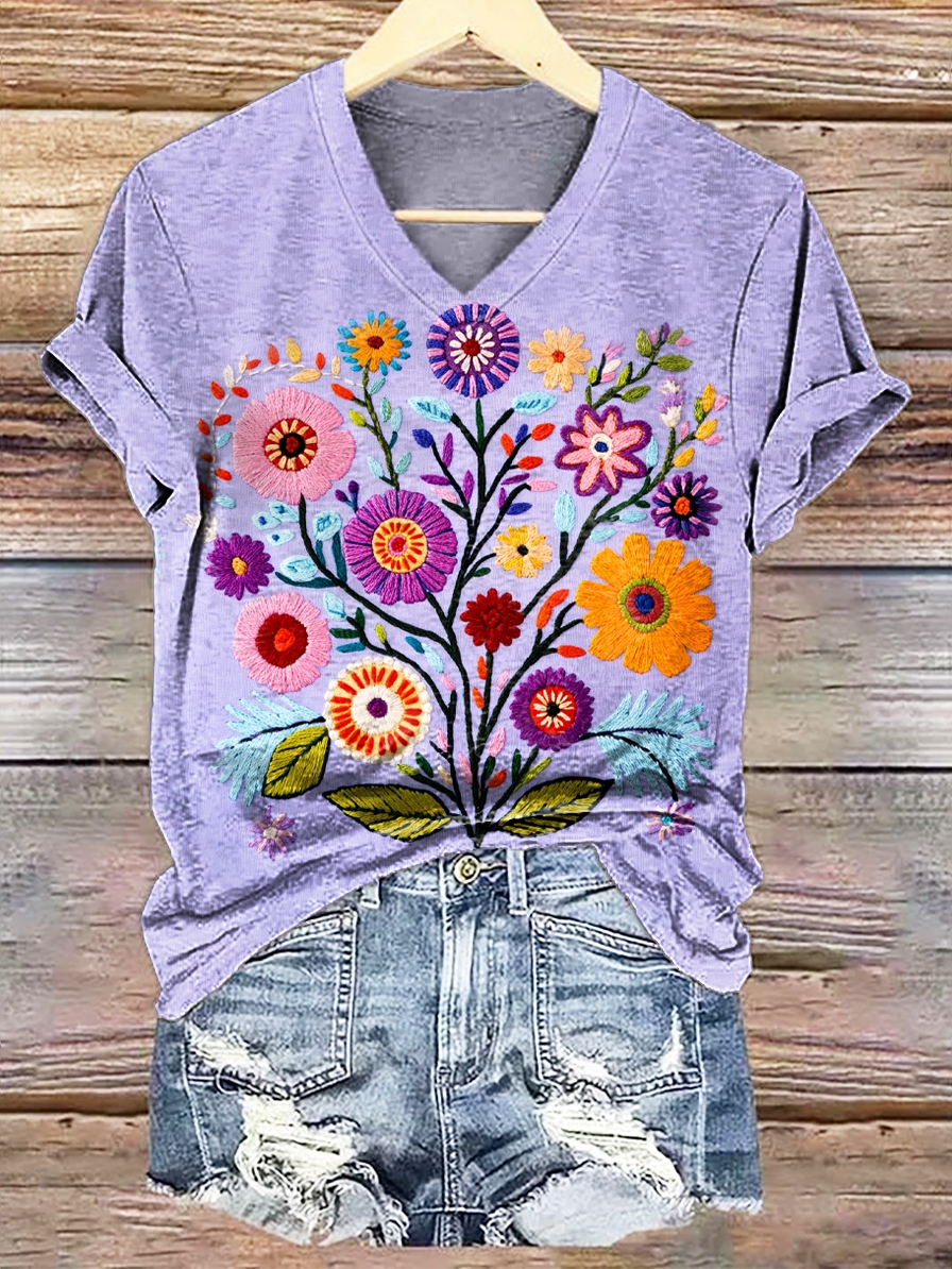 Women's Folk Art Floral Pattern Printed Casual V-neck T-shirt