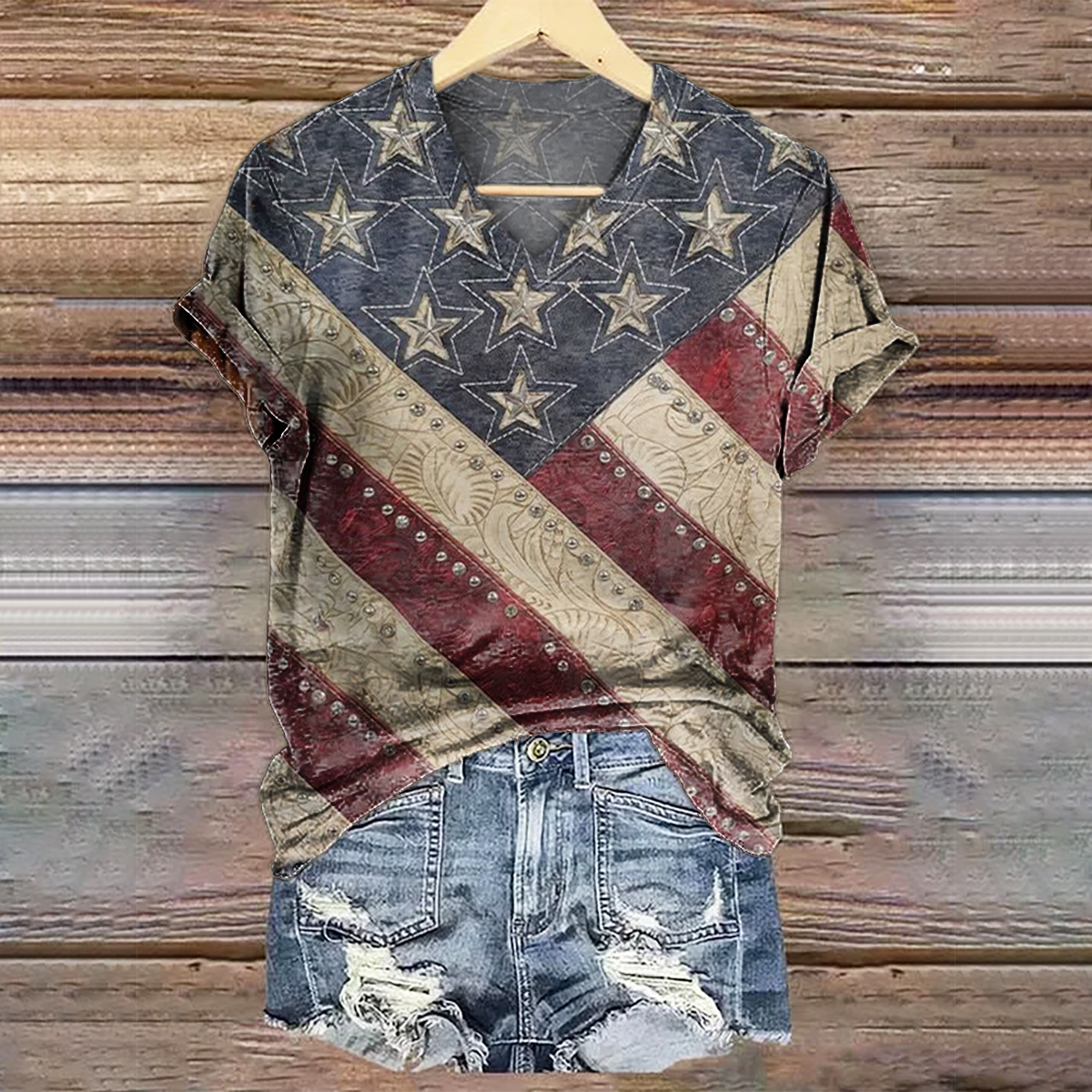 Women's Vintage Flag Floral Patchwork Art Print V-neck Casual T-Shirt