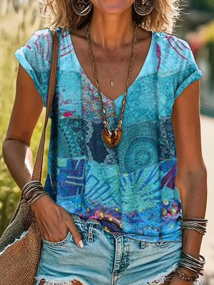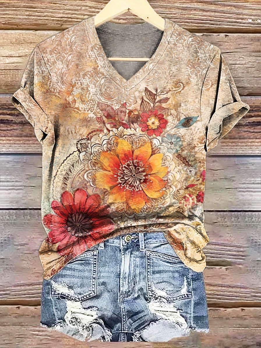 Women's Bohemian Floral Art Print V-neck Casual T-Shirt