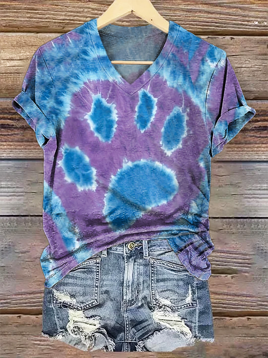 Women's Tie-Dye Cat's Paw Art Print V-Neck Casual T-Shirt
