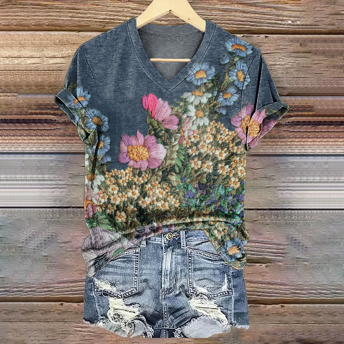 Colorful Flower Print 100%Cotton V-neck T-Shirt