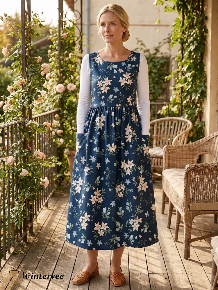 Blue Background White Flowers Printed Apron & Dress (2-in-1)