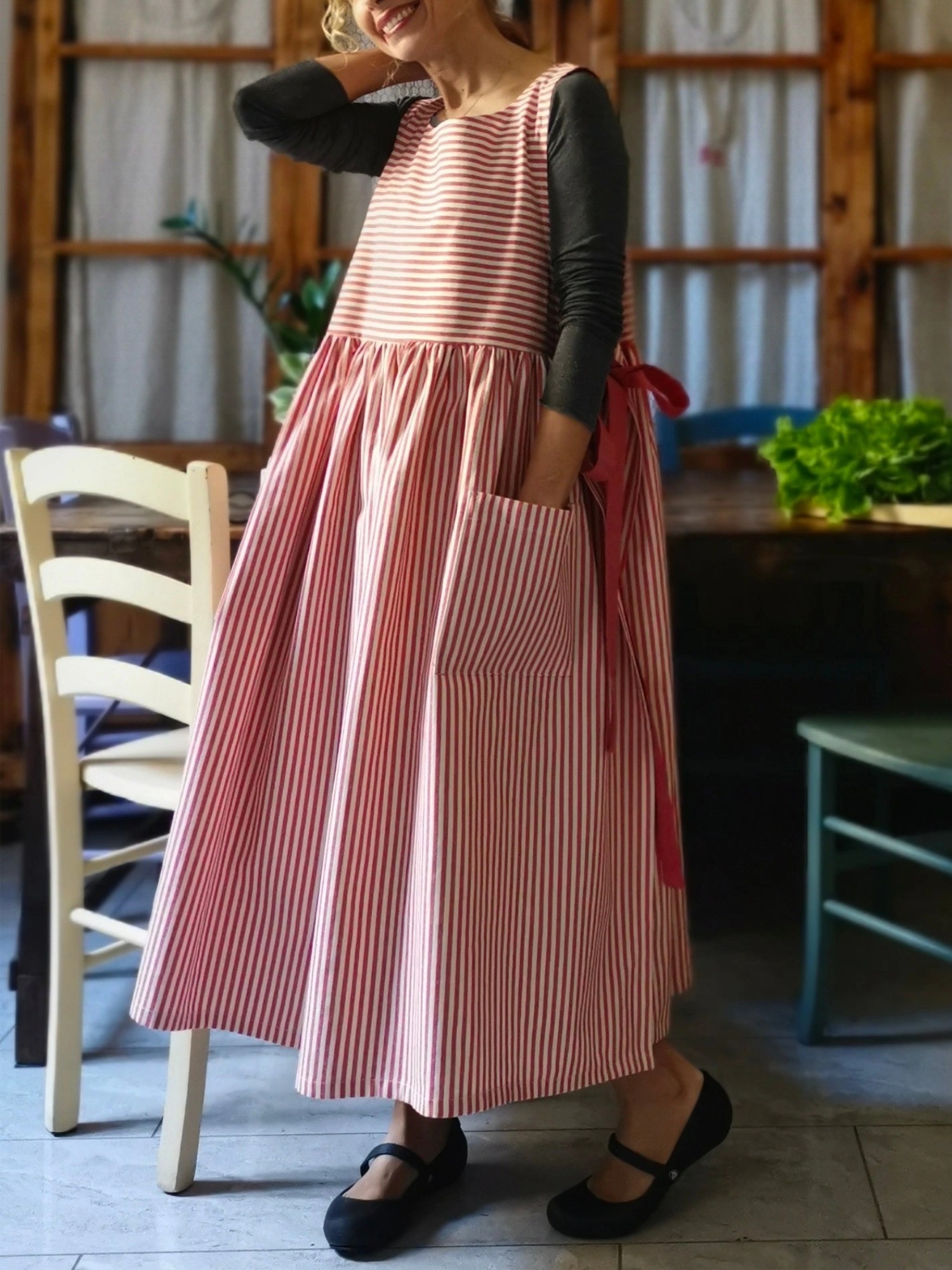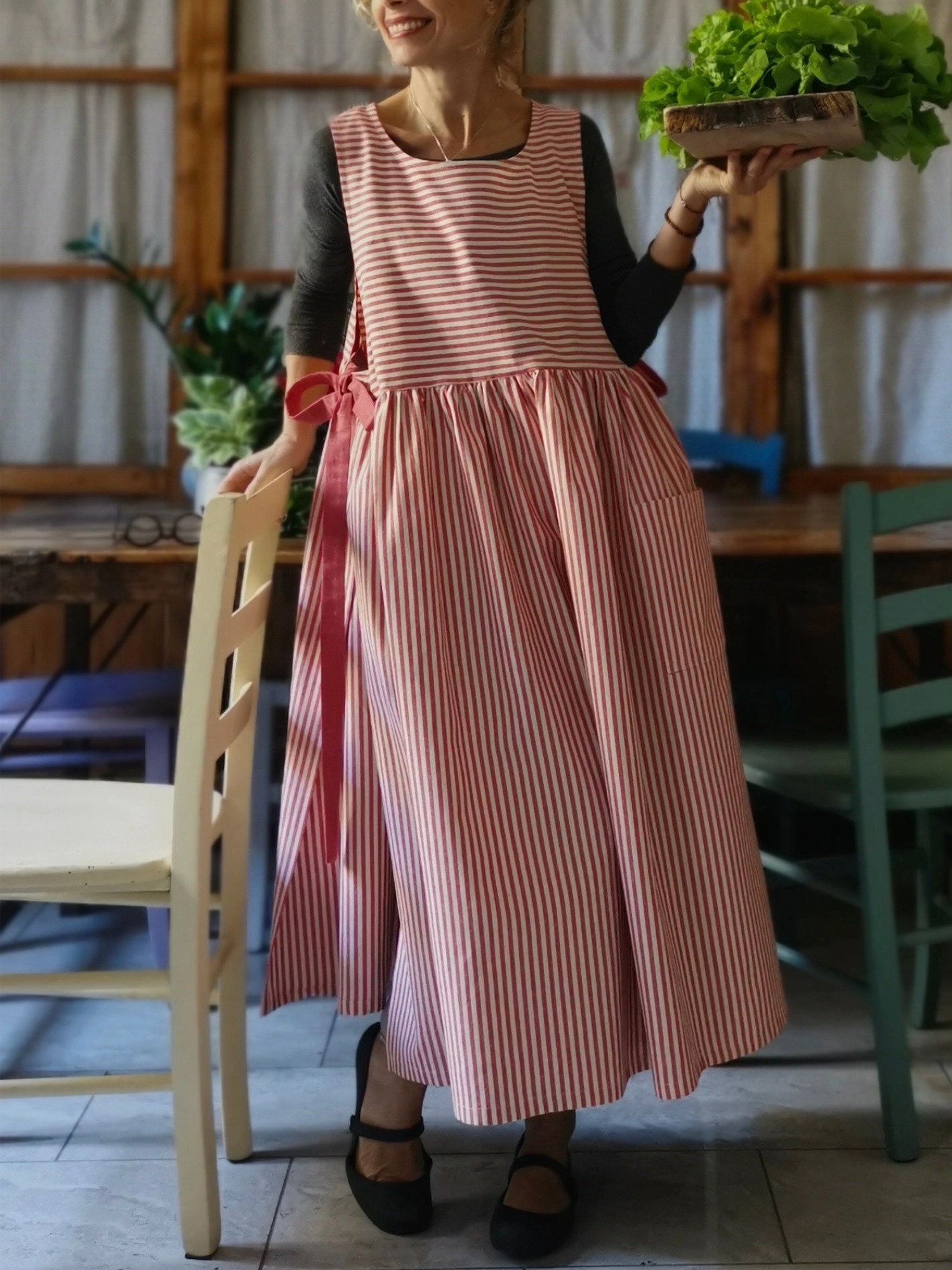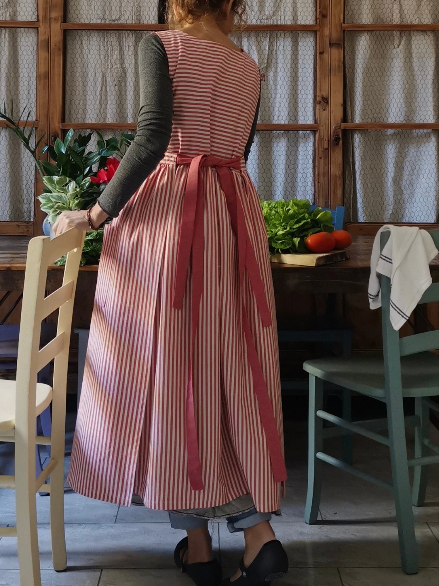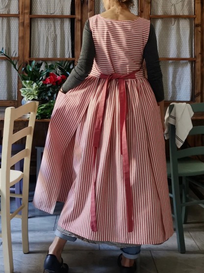 Cherry Red Striped Cotton Kitchen Apron