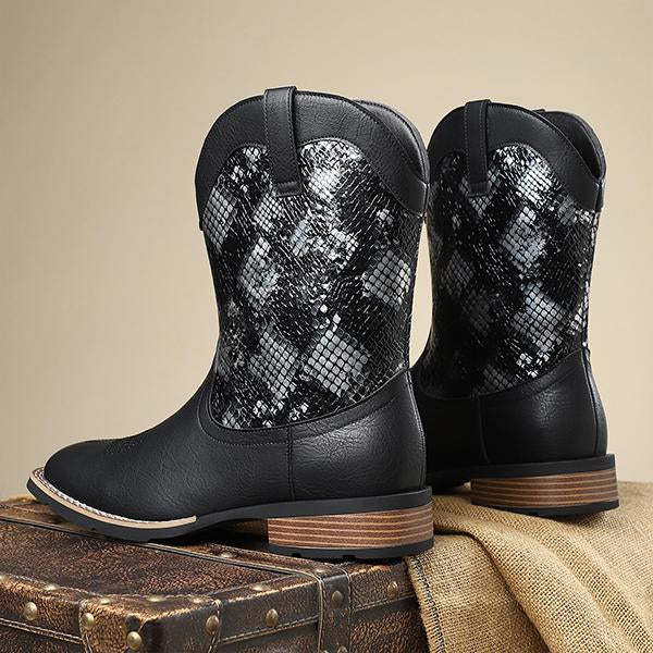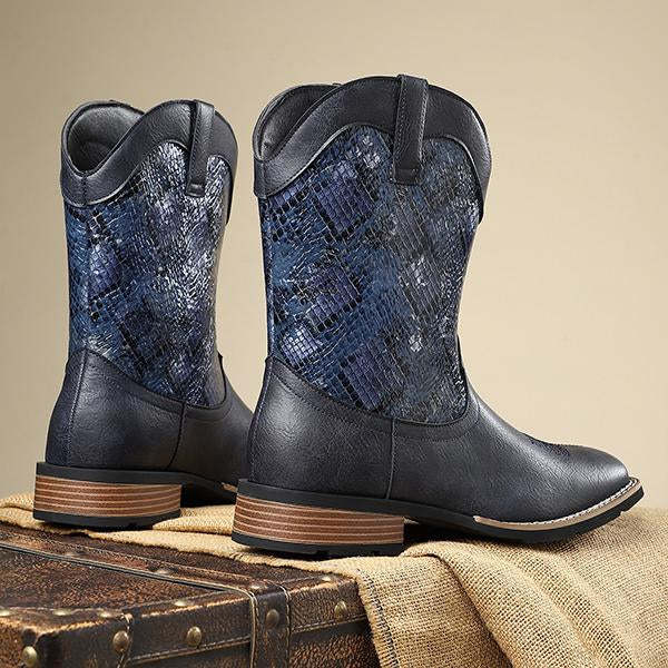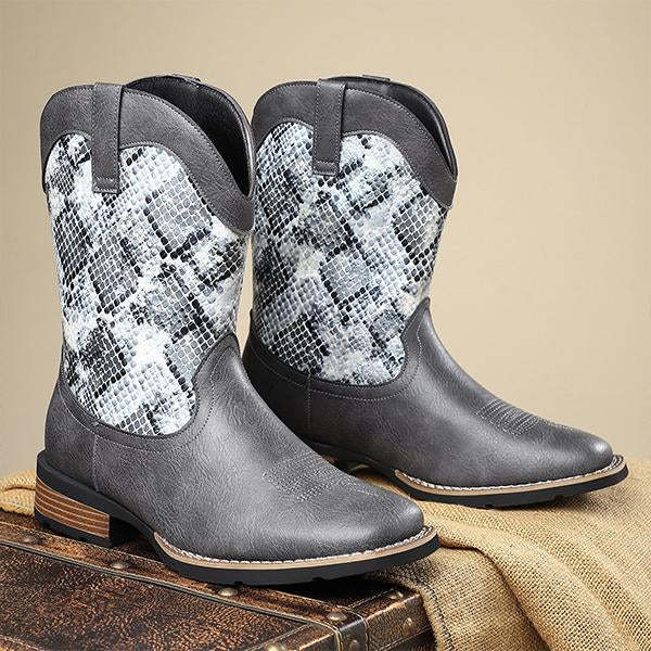 The Men's Retro Snake Print Mid-Calf Western Boots combine bold, contemporary style with classic Western elements, creating a striking and distinctive look. Made from high-quality synthetic materials, these boots feature an eye-catching snake print design that adds texture and attitude to the traditional Western silhouette. The mid-calf height offers a perfect balance of style and practicality, making them ideal for both fashion-forward looks and functional wear. With a comfortable fit and durable construction, these boots are designed to provide both comfort and long-lasting wear. The signature Western stitching and pointed toe add authentic details, while the stacked heel ensures stability and a confident stride. Perfect for adding a touch of rugged flair to jeans, trousers, or even more adventurous outfits, these boots embody a retro-inspired, bold aesthetic that stands out in any setting. Whether you're looking to make a statement at a night out or add edge to your everyday wardrobe, these boots are the perfect blend of Western heritage and modern style.