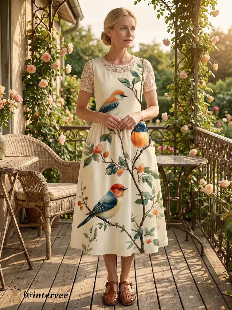 Perched Birds Natural Print Apron & Dress (2-in-1)