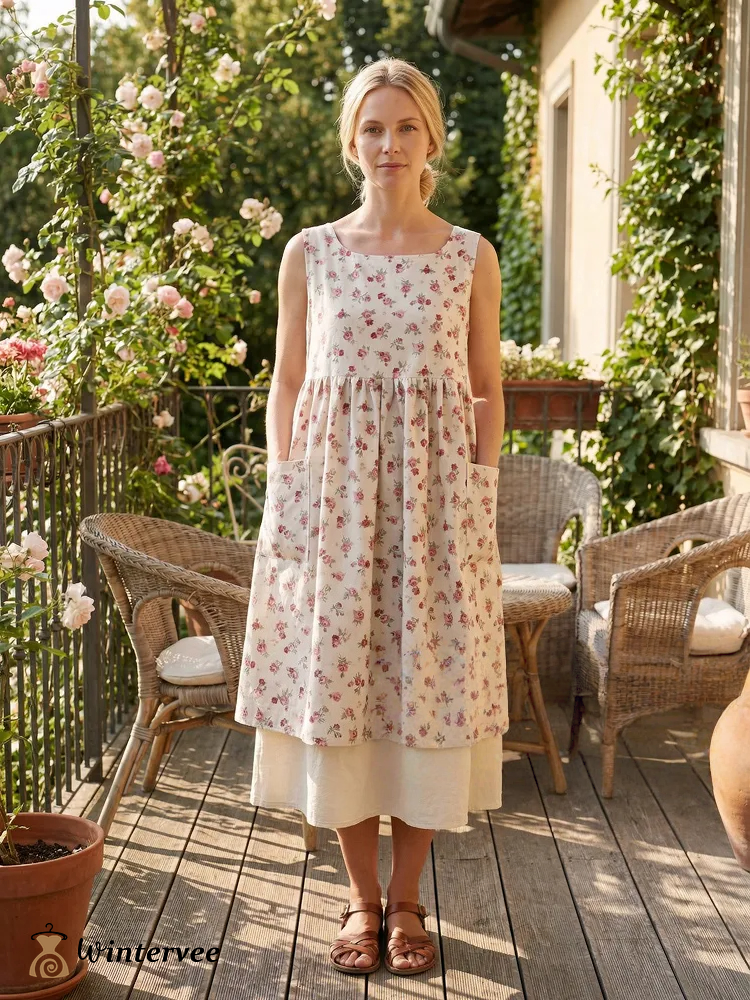 Vintage Beige Base Pink Floral Print Long Apron & Dress (2-in-1)