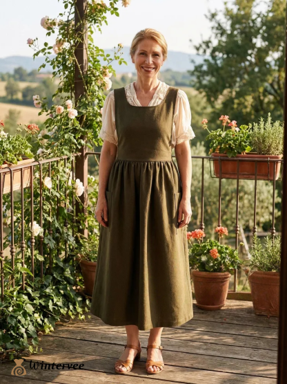 Vintage Dark Green Solid Long Apron & Dress (2-in-1)