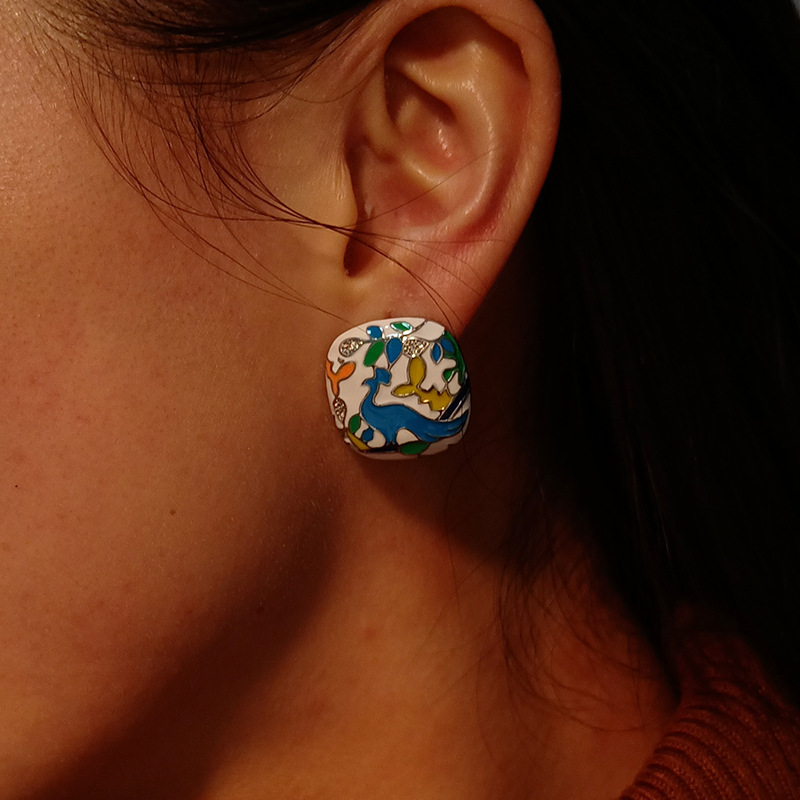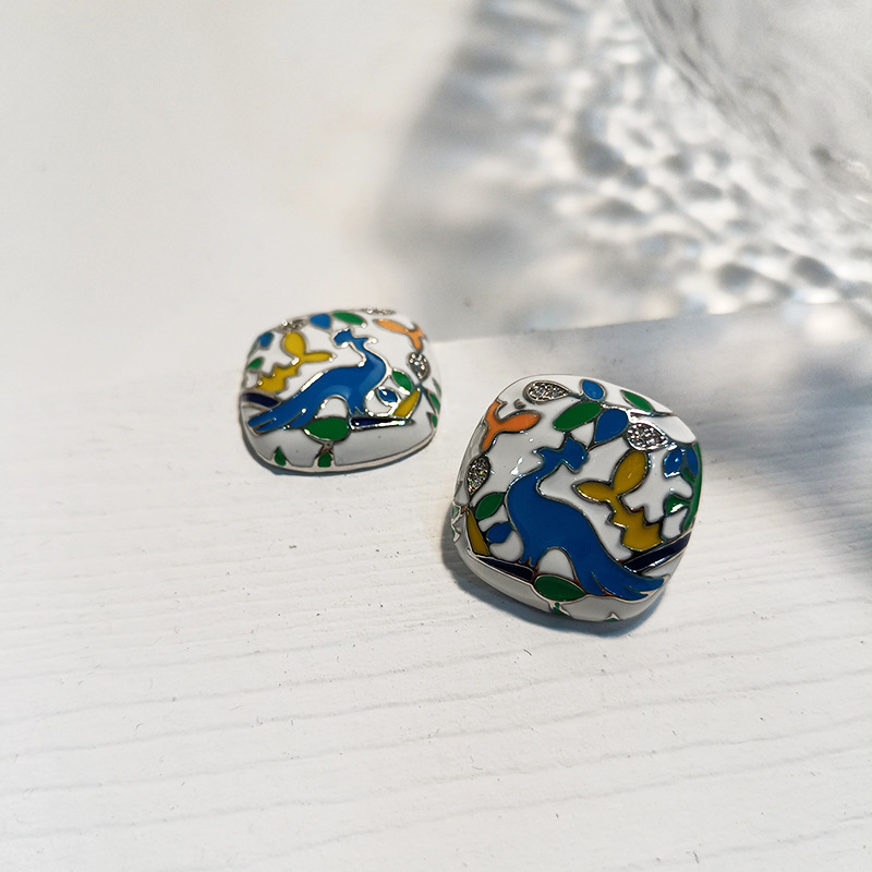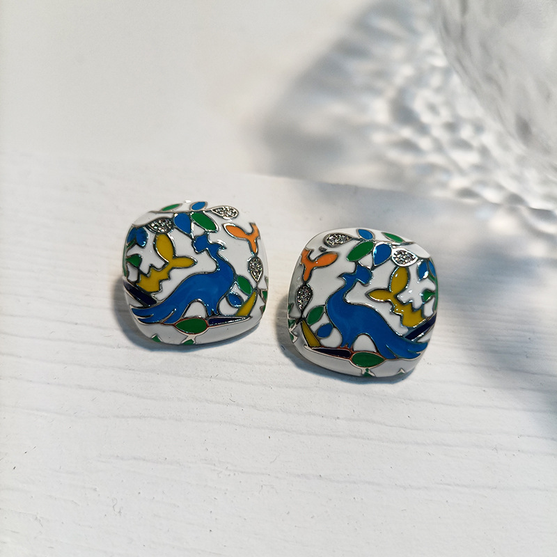 Enamel Flower and Bird Earrings Multicolored Enamel Square Earrings