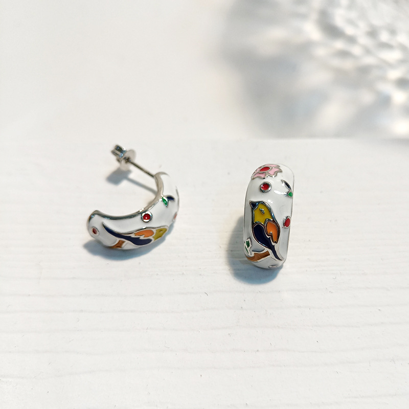 Enamel Flower and Bird Earrings