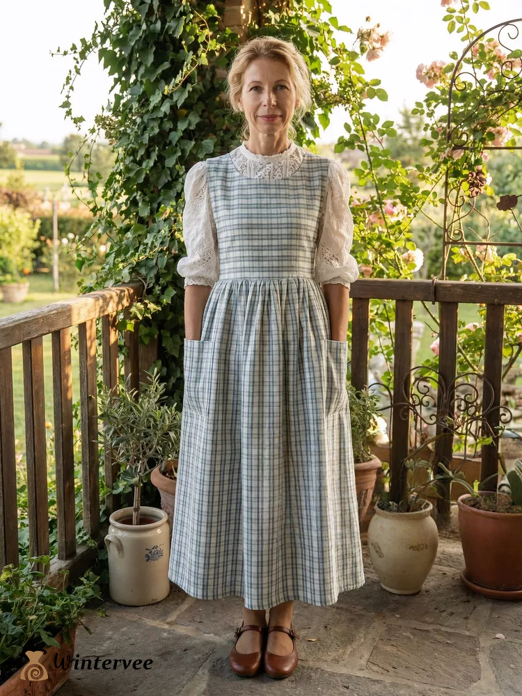 Vintage Light Blue & Cream Thin Plaid Long Apron & Dress (2-in-1)