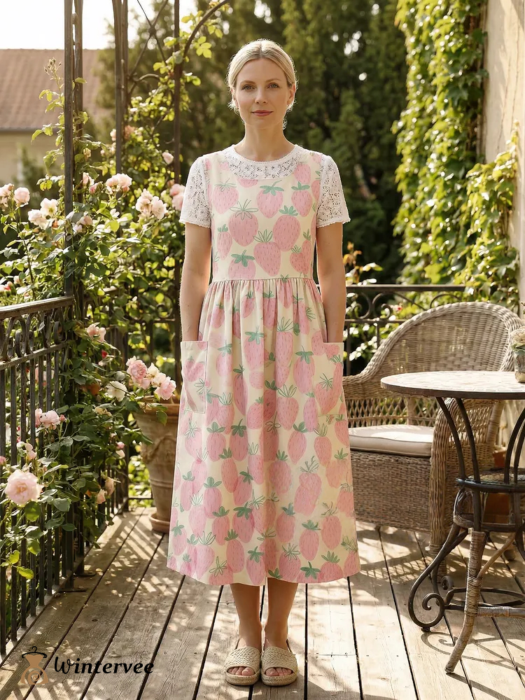 Vintage Pink Strawberry Print Long Apron & Dress (2-in-1)