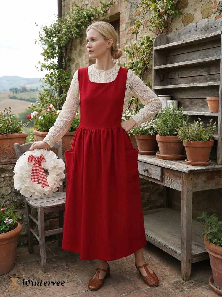 Vintage Red Apron & Dress (2-in-1) with Pockets