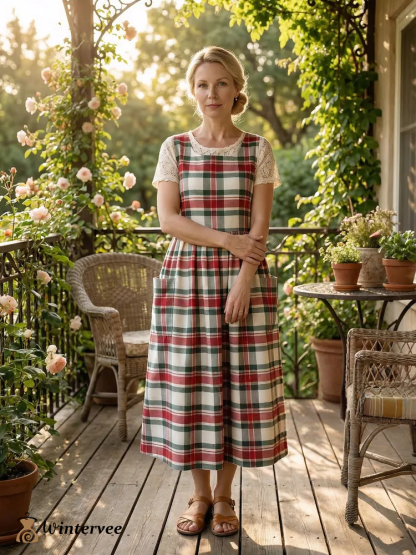 Vintage Red-White-Green Plaid Long Apron & Dress (2-in-1)