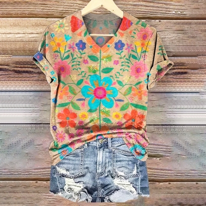 Women's Bohemian Floral Art Print V-neck Casual T-Shirt