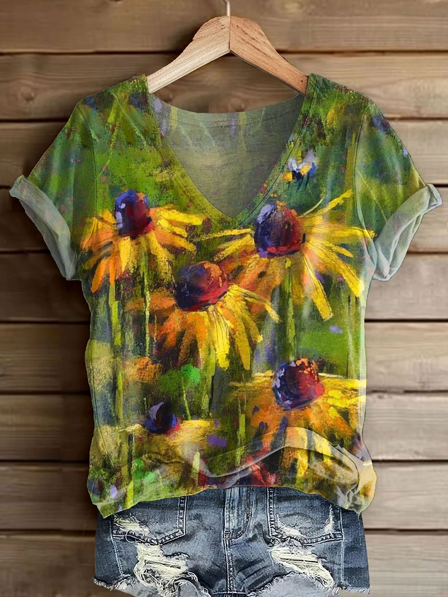 Women's Bohemian Floral Art Print V-neck Casual T-Shirt