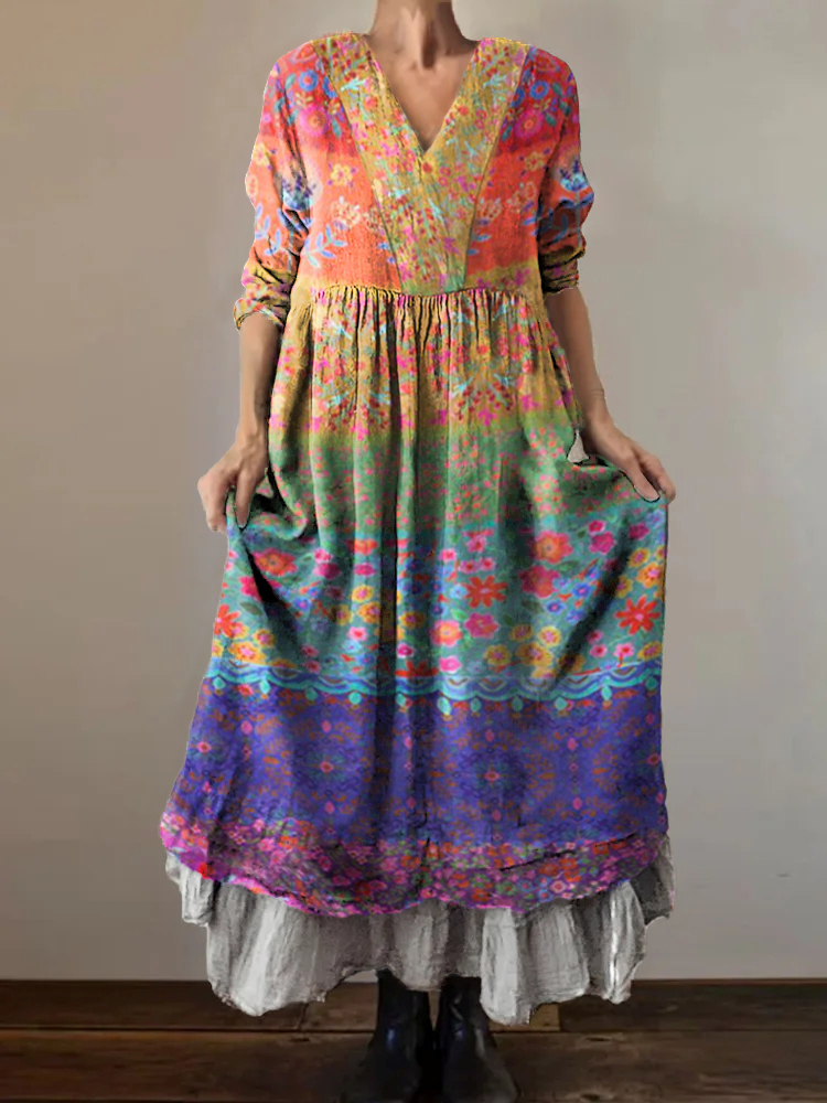 Women's Bohemian Floral Patchwork Art Pattern Print V-Neck Pocket Cotton Dress