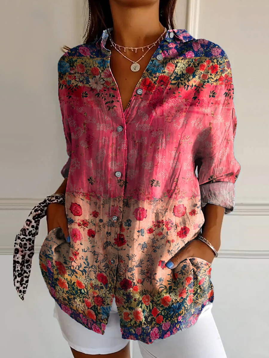 Women's Floral Pattern Art Print Casual Cotton Shirt
