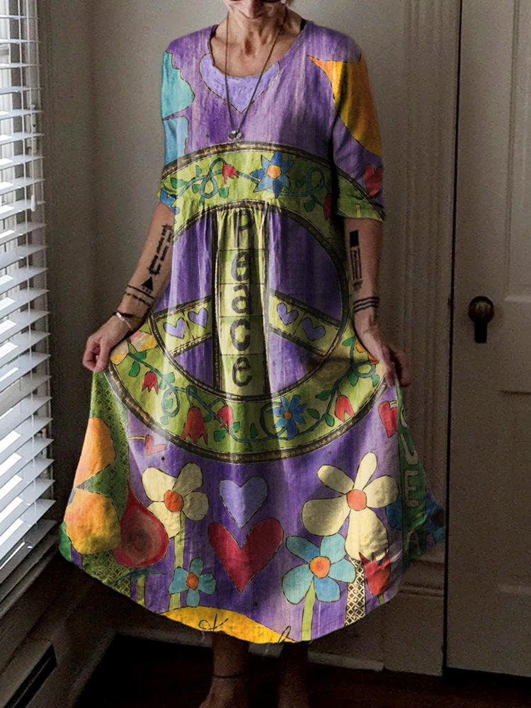 Women's Hippie Peace Art Print Pocket Cotton Dress