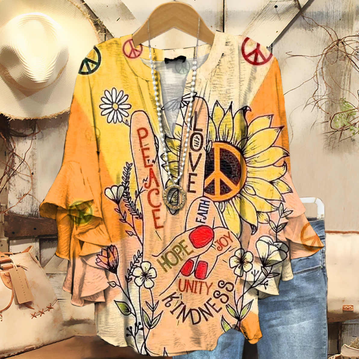 Women's Hippie Peace Love Art Print Casual Cotton And Linen Shirt