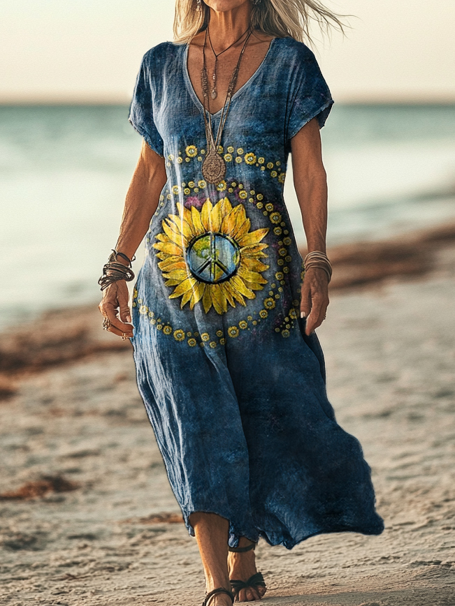 Women's Hippie Tie Dye Art Print Pocket Cotton Dress