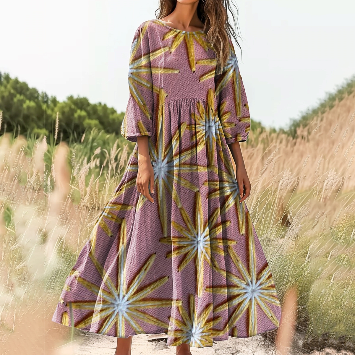 Women's Polygonal Star Pattern Art Print Cotton Crew Neck Dress
