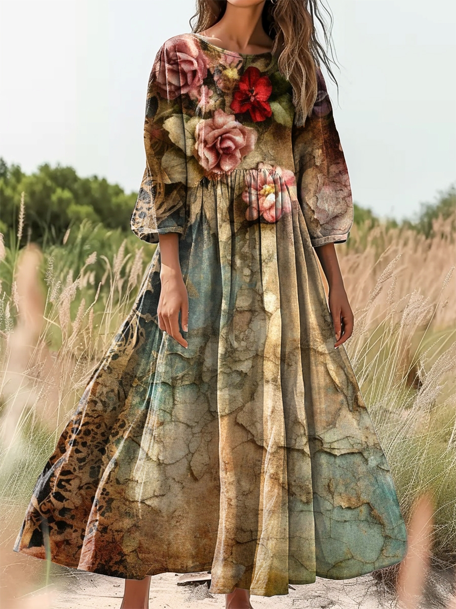 Women's Retro Floral Nostalgic Art Print Flowy Cotton Crew Neck Dress