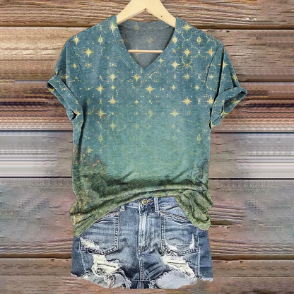 Women's Starry Night Woods Art Print V-Neck T-Shirt
