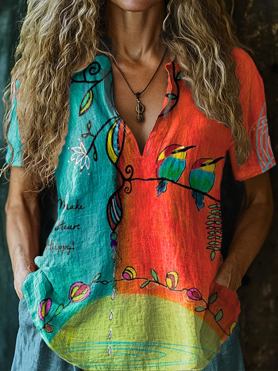 Women's Vintage Bird Art Print Casual Short Sleeve Comfortable Cotton Shirt