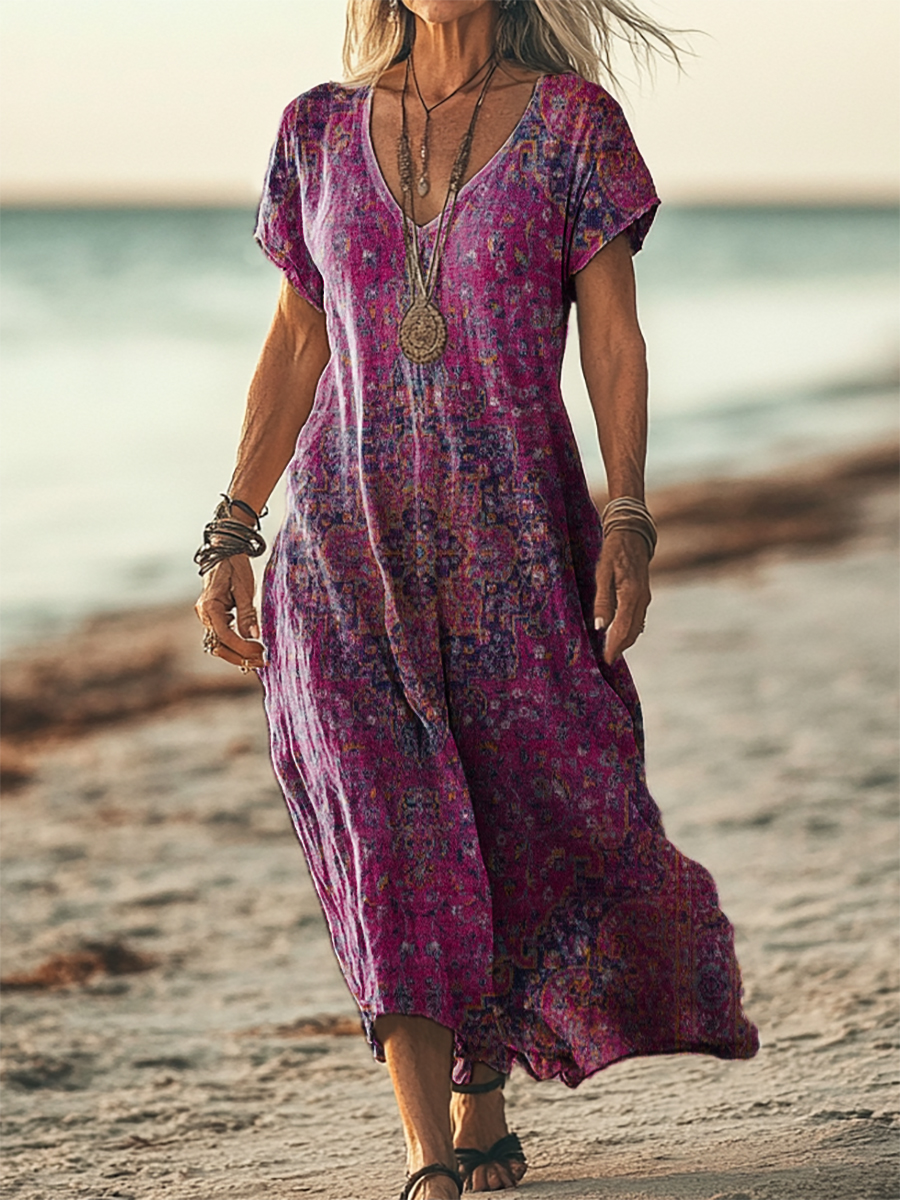 Women's Vintage Ethnic Art Patterns Print Short Sleeve Pocket Cotton Linen Dress