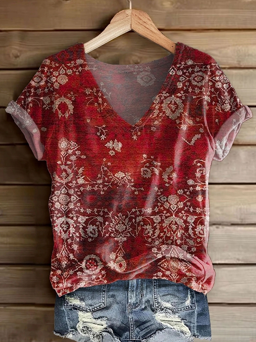 Women's Vintage Ethnic Art Print V-Neck Cotton T-Shirt