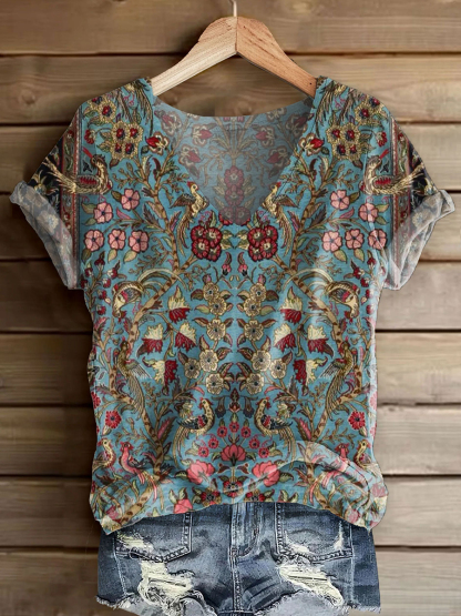 Women's Vintage Ethnic Floral Art Print V-neck Casual T-Shirt