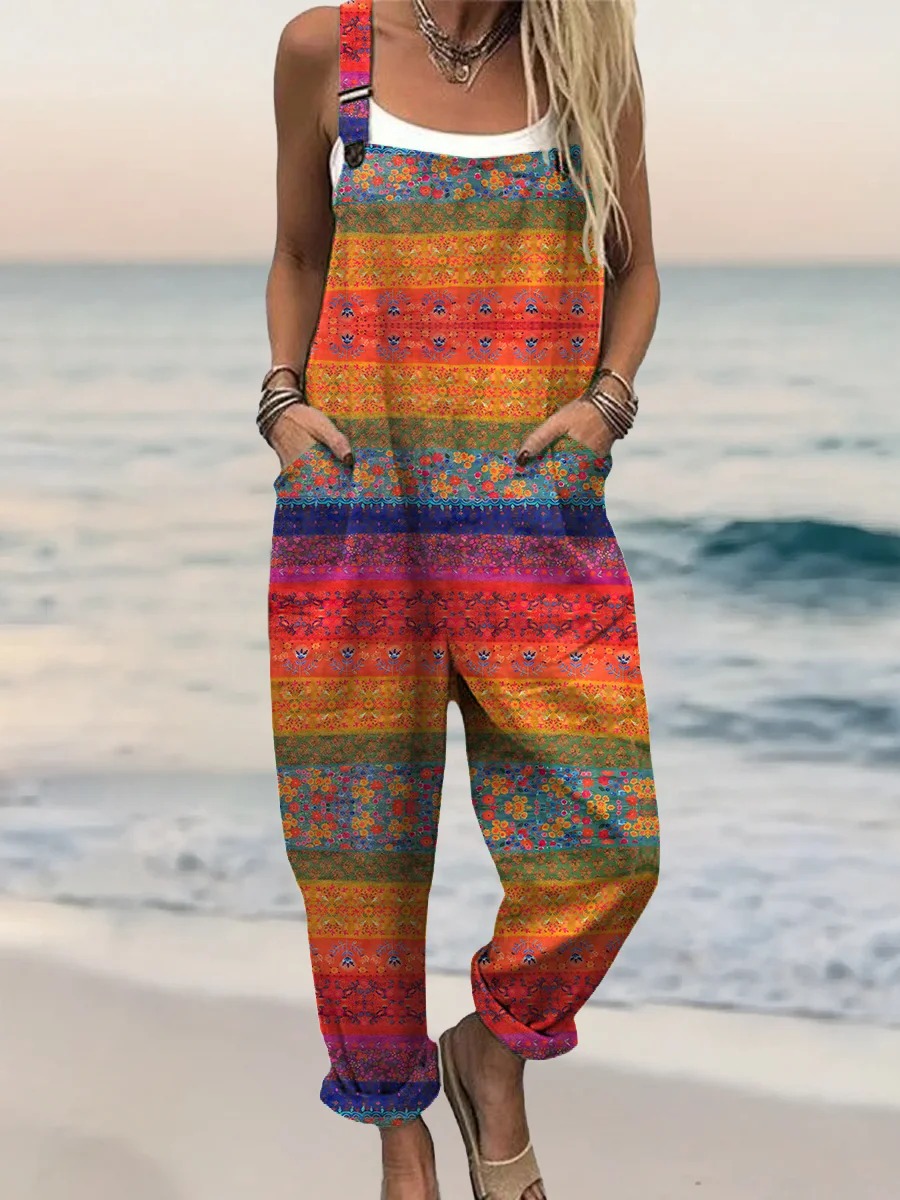 Women's Vintage Floral Art Print Sleeveless Cotton Pocket Dress