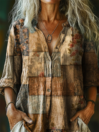 Women's Vintage Floral Patchwork Art Print Casual Cotton Linen Shirt