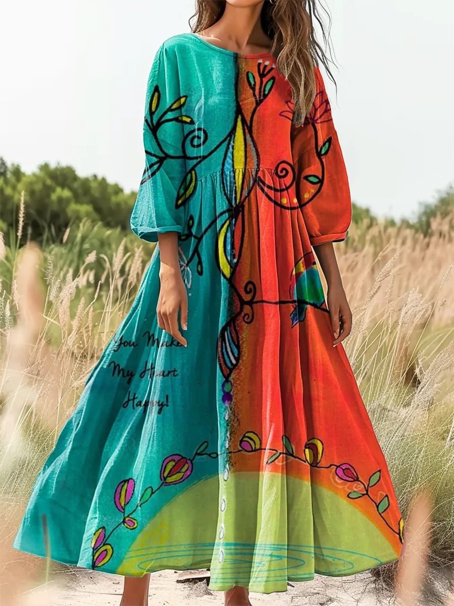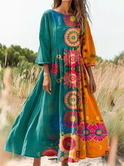 Women's Vintage Folk Art Floral Pattern Print Pocket Cotton Dress