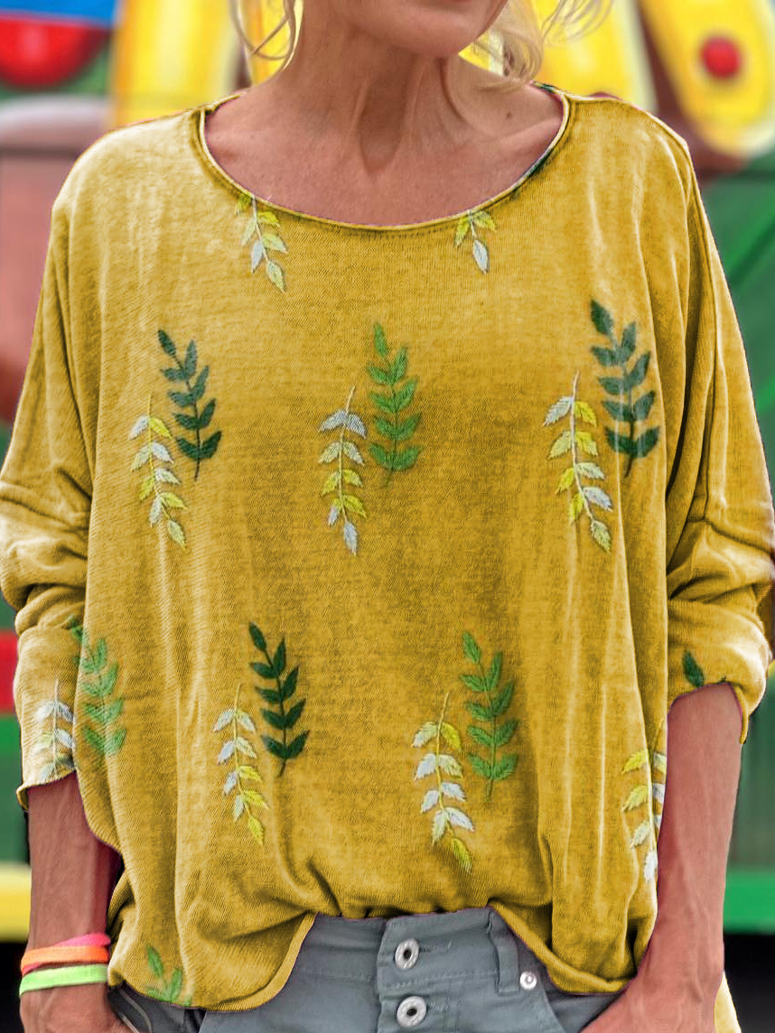 Women's Vintage Leaf Art Print Casual Long Sleeve T-shirt