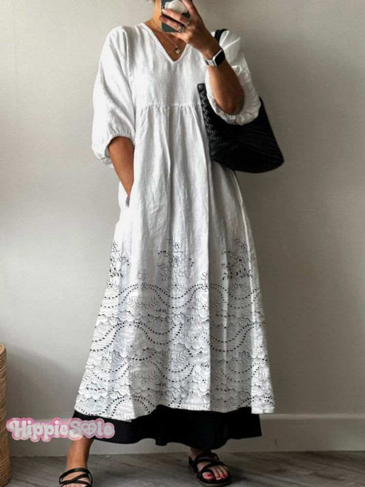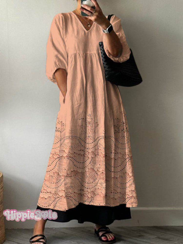 Women's Vintage Lovely Floral Lace Pattern Art Print Pocket V-neck Cotton Dress