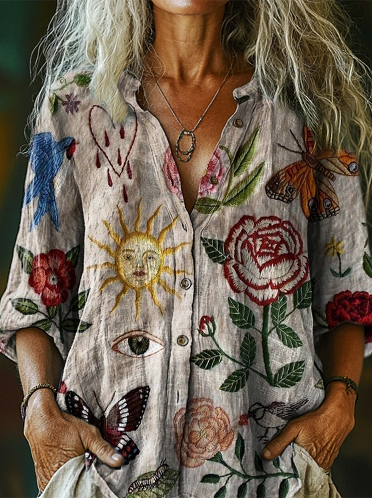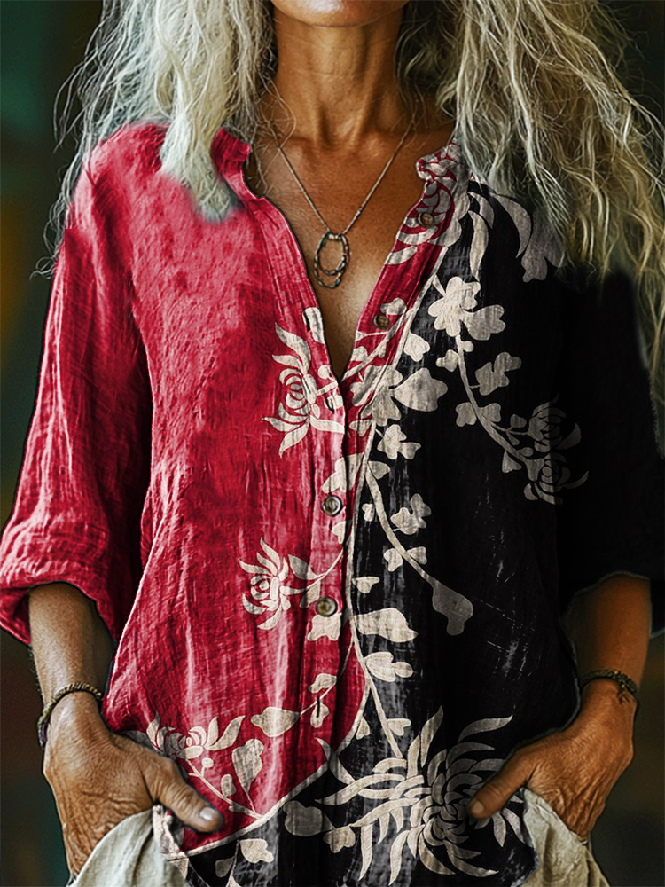 Women's Vintage Floral Art Print Casual Cotton Linen Shirt