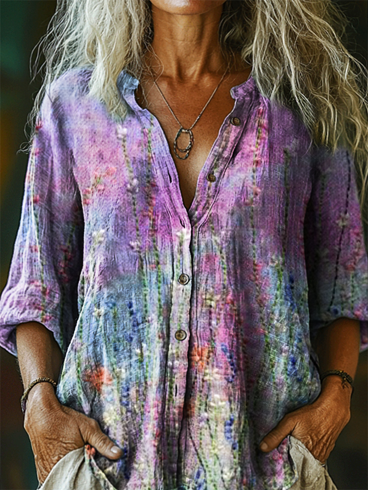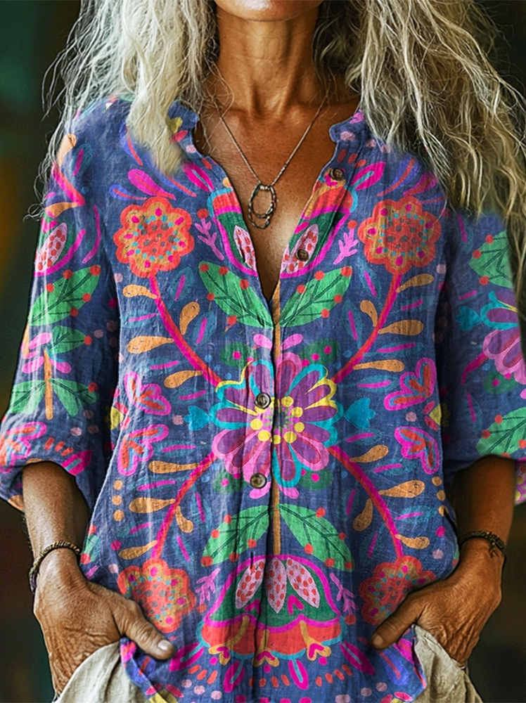 Women's Bohemian Floral Art Print Casual Cotton Linen Shirt