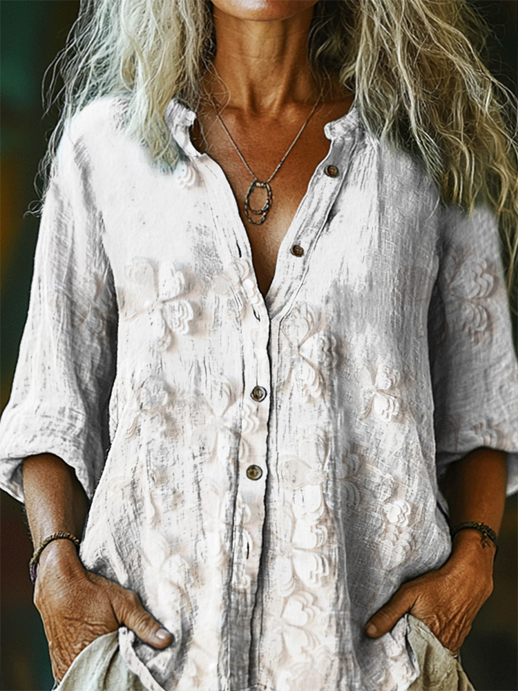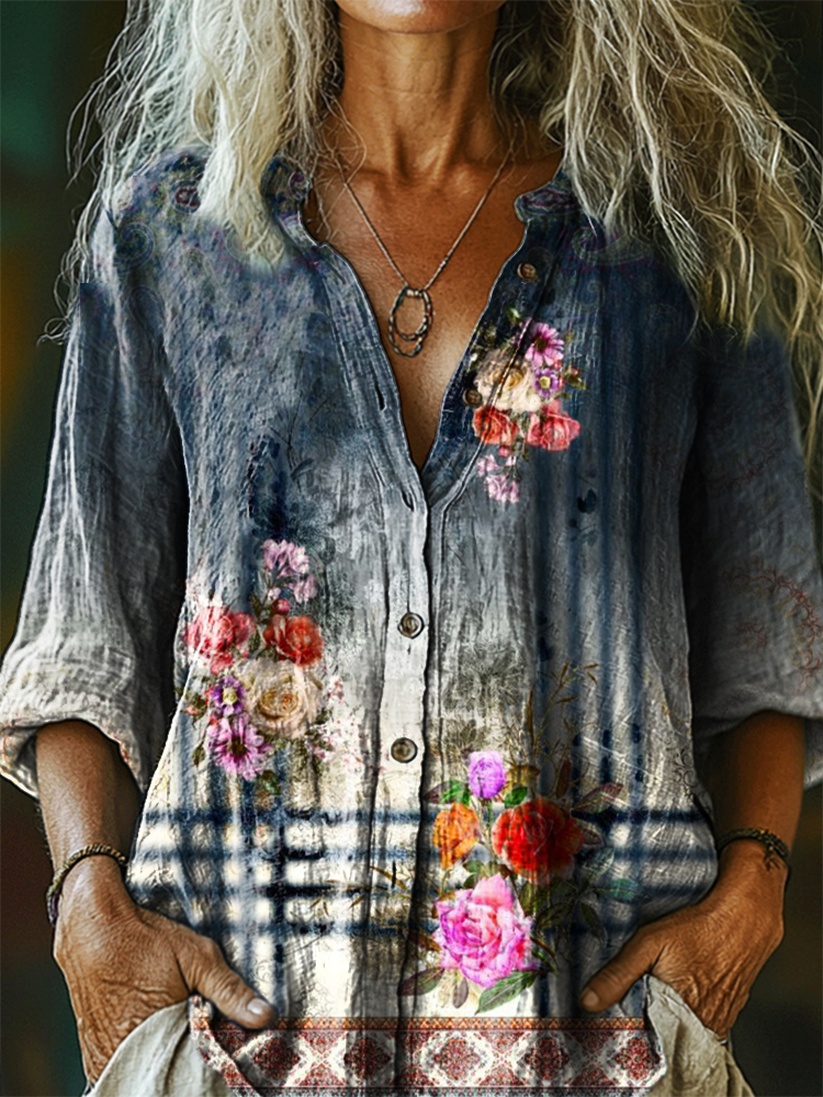 Women's Flowers Art Print Casual Cotton And Linen Shirt
