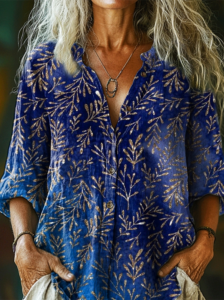 Women's Vintage Leaf Art Print Casual Cotton Linen Shirt