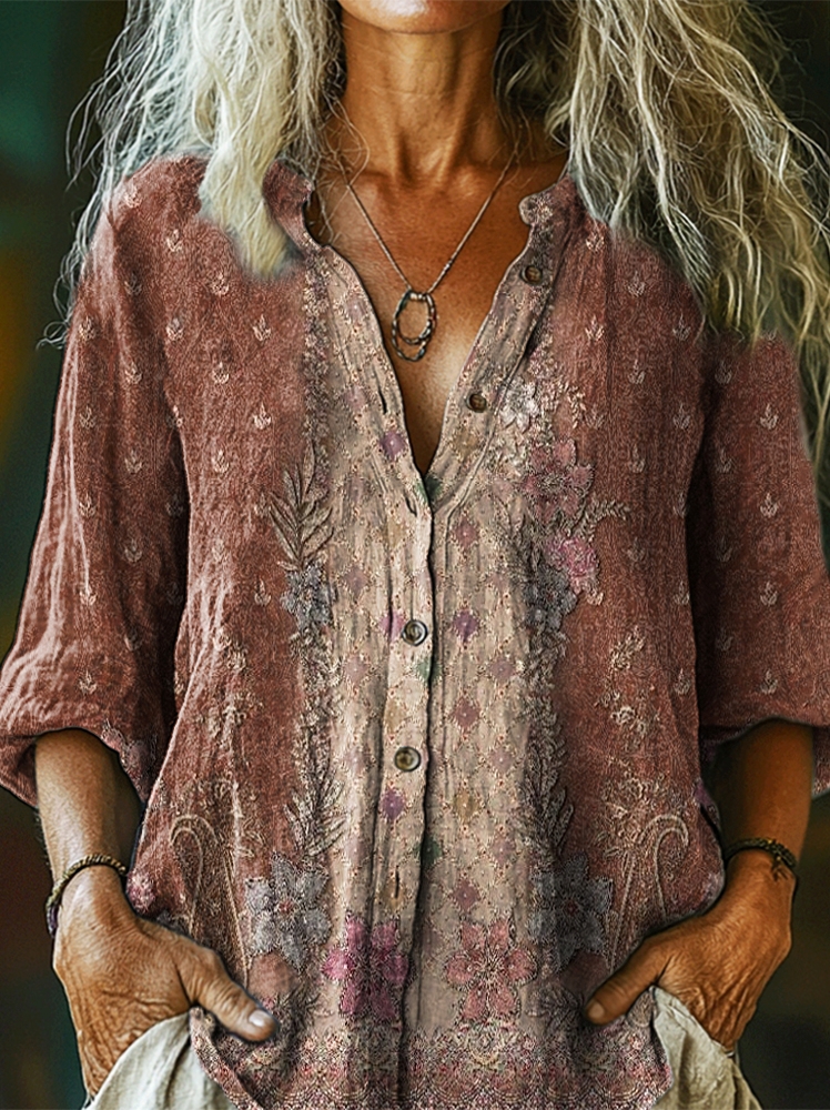 Women's Vintage Ethnic Floral Art Print Casual Cotton Linen Shirt