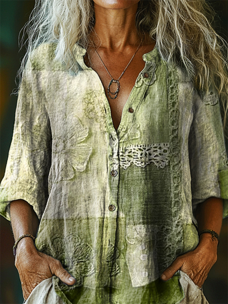 Women's Vintage Lace Floral Art Print Casual Cotton Linen Shirt