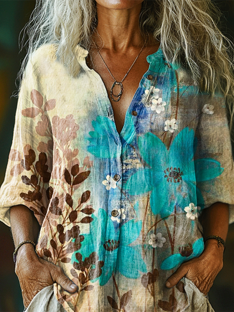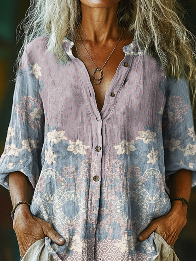 Women's Bohemian Floral Art Print Casual Cotton Linen Shirt