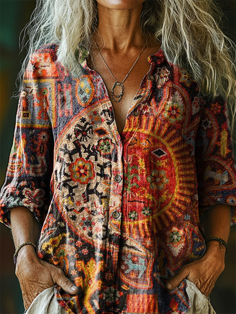 Women's Vintage Bohemian Pattern Art Print Casual Cotton Linen Shirt
