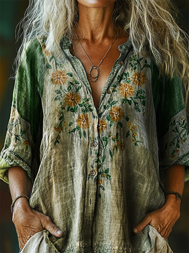 Women's Vintage Bohemian Floral Art Print Casual Cotton Linen Shirt